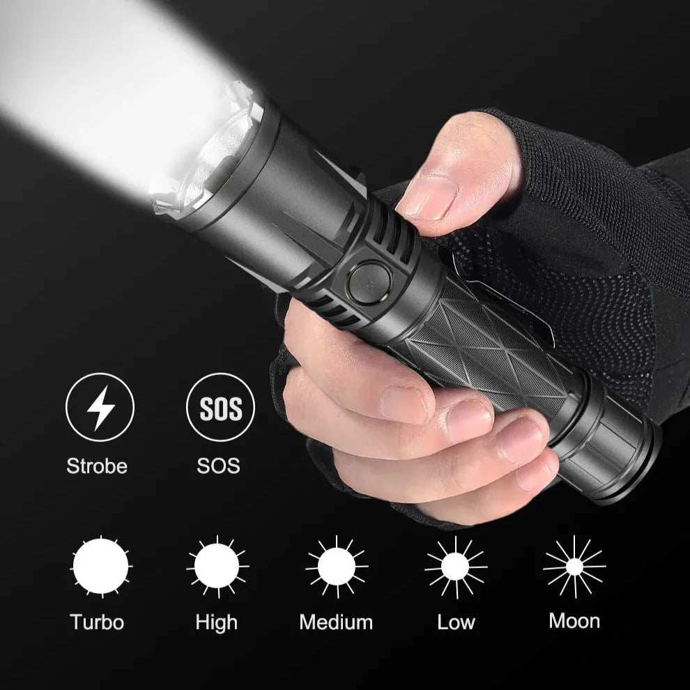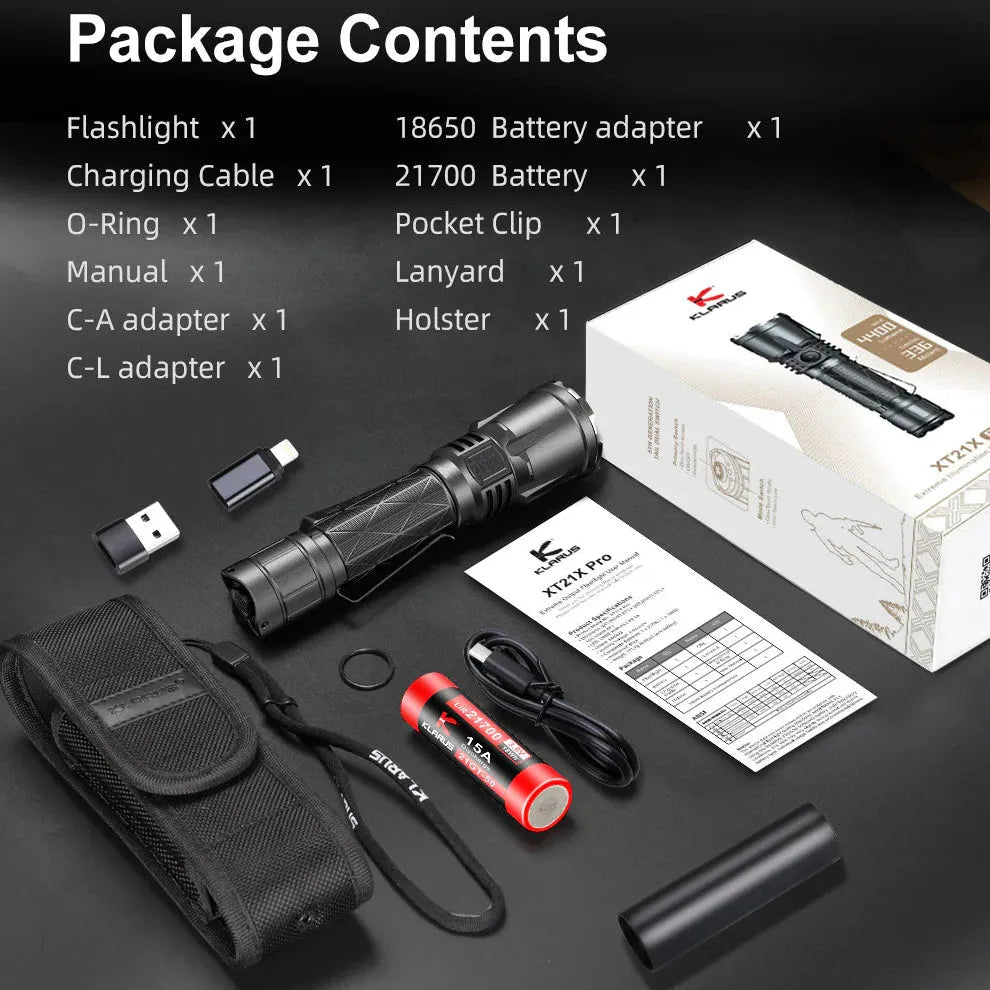 KLARUS XT21X Pro er en kraftig oppladbar taktisk lommelykt med en imponerende lysstyrke på opptil 4400 lumen og en rekkevidde på 316 meter. Perfekt for taktiske operasjoner, friluftsliv og nødbruk.