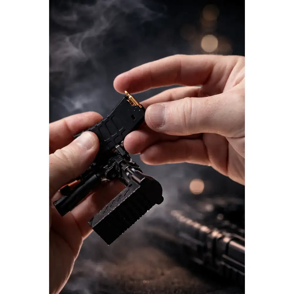 Detaljrik AR15-replika i 1:3 skala med skeletonized design og bevegelige funksjoner. NECROMANCER er en diecast metallmodell med moderne S-K-E-L-E-T-O-N body, laget for deg som vil ha en kompakt samlermodell med realistiske detaljer og mulighet til å «cycle» dummy patroner.