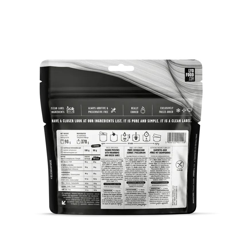 LYOFOOD Mash & Cheese kombinerer myk potetmos med smeltet ost for å gi en varm og mettende middag uansett hvor du er. Laget med 100 % naturlige ingredienser, uten gluten eller kunstige tilsetninger. Denne glutenfrie, vegetariske retten er perfekt for fjellturer, ekspedisjoner og campingturer hvor enkelhet og energi teller.