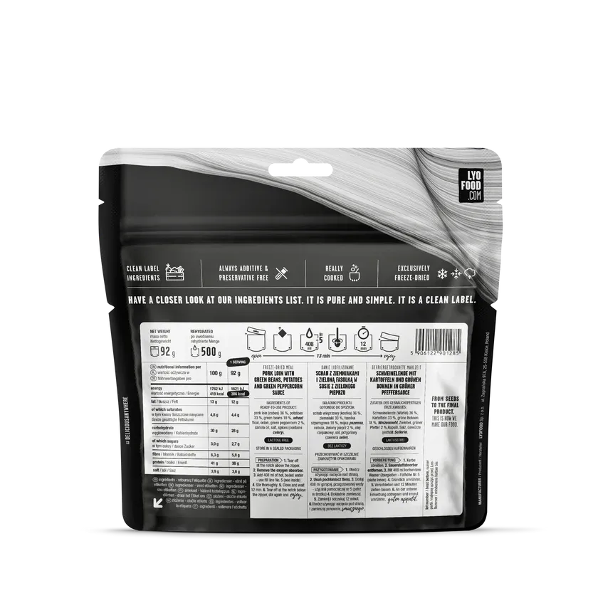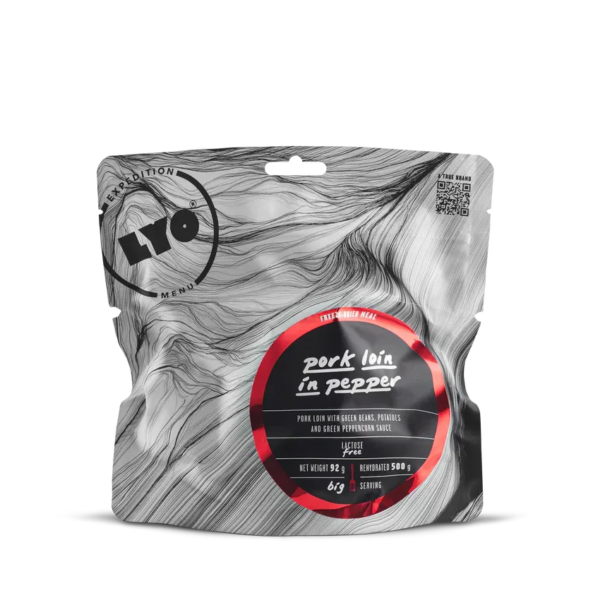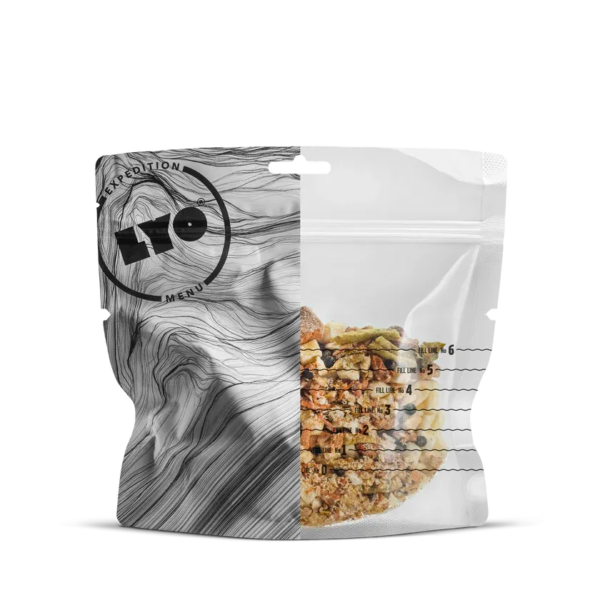 LYOFOOD Svinegryte med potet kombinerer møre biter av svinekjøtt med kokte poteter og en smaksrik saus laget av grønnsaker og krydder. Retten er laget med 100 % naturlige ingredienser, uten konserveringsmidler, og er frysetørket for å gi lav vekt og lang holdbarhet. Perfekt for deg som ønsker ekte, kraftig turmat etter en lang dag ute.