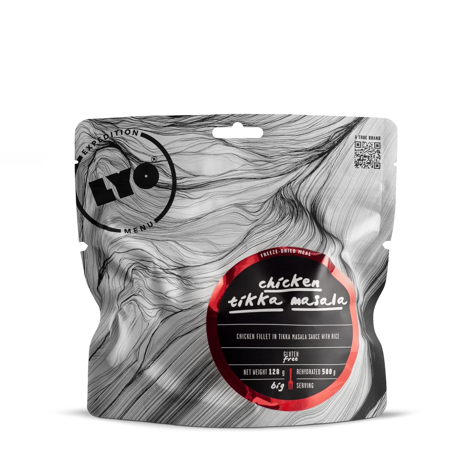 Opplev den ikoniske smaken av tikka masala på dine eventyr! LYOFOOD Kylling Tikka Masala er laget av møre kyllingbiter, kremet tomatsaus og tradisjonelle indiske krydder. 100 % naturlige ingredienser, ingen konserveringsmidler, frysetørket for ekstremt lav vekt og lang holdbarhet. Perfekt for fjellturer, ekspedisjoner og campingturer hvor du ønsker en smakfull og næringsrik middag.