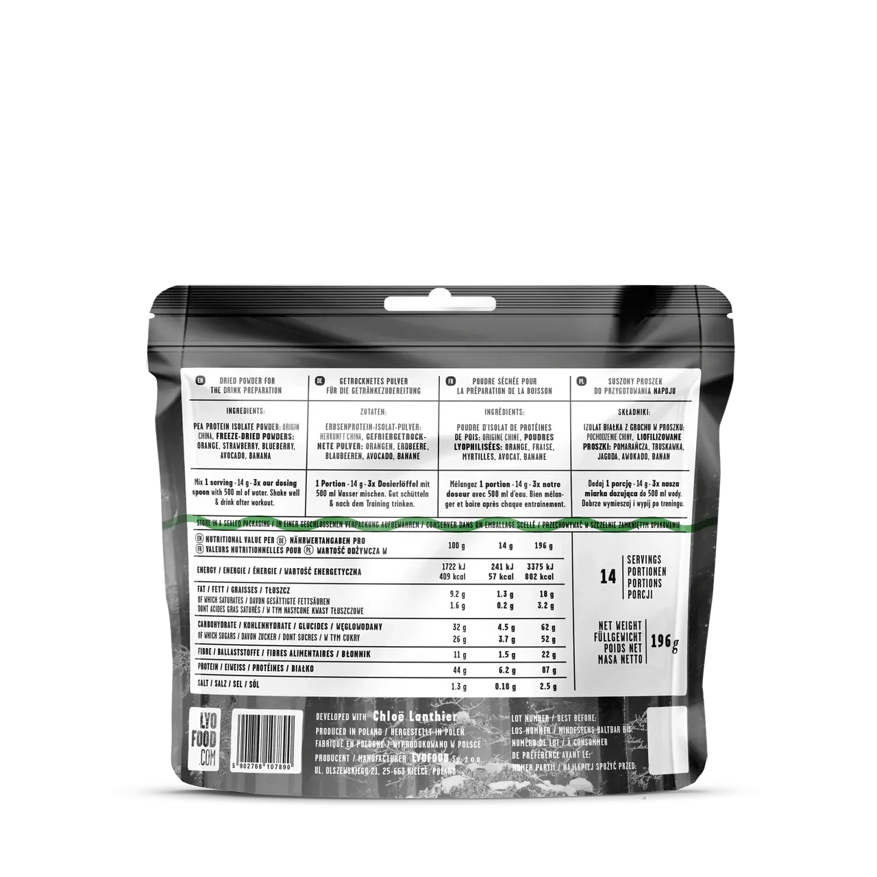 LYOFOOD Recovery Formula er en frysetørket sportsdrikk utviklet for å støtte muskelreparasjon og restitusjon etter tur, trening eller fysisk arbeid. Med naturlige ingredienser som jordbær, blåbær, banan, appelsin, avokado og erteprotein, gir den kroppen protein, elektrolytter og naturlig energi – uten kunstige tilsetningsstoffer. Enkel å blande ut i vann og drikkes rett etter aktivitet.