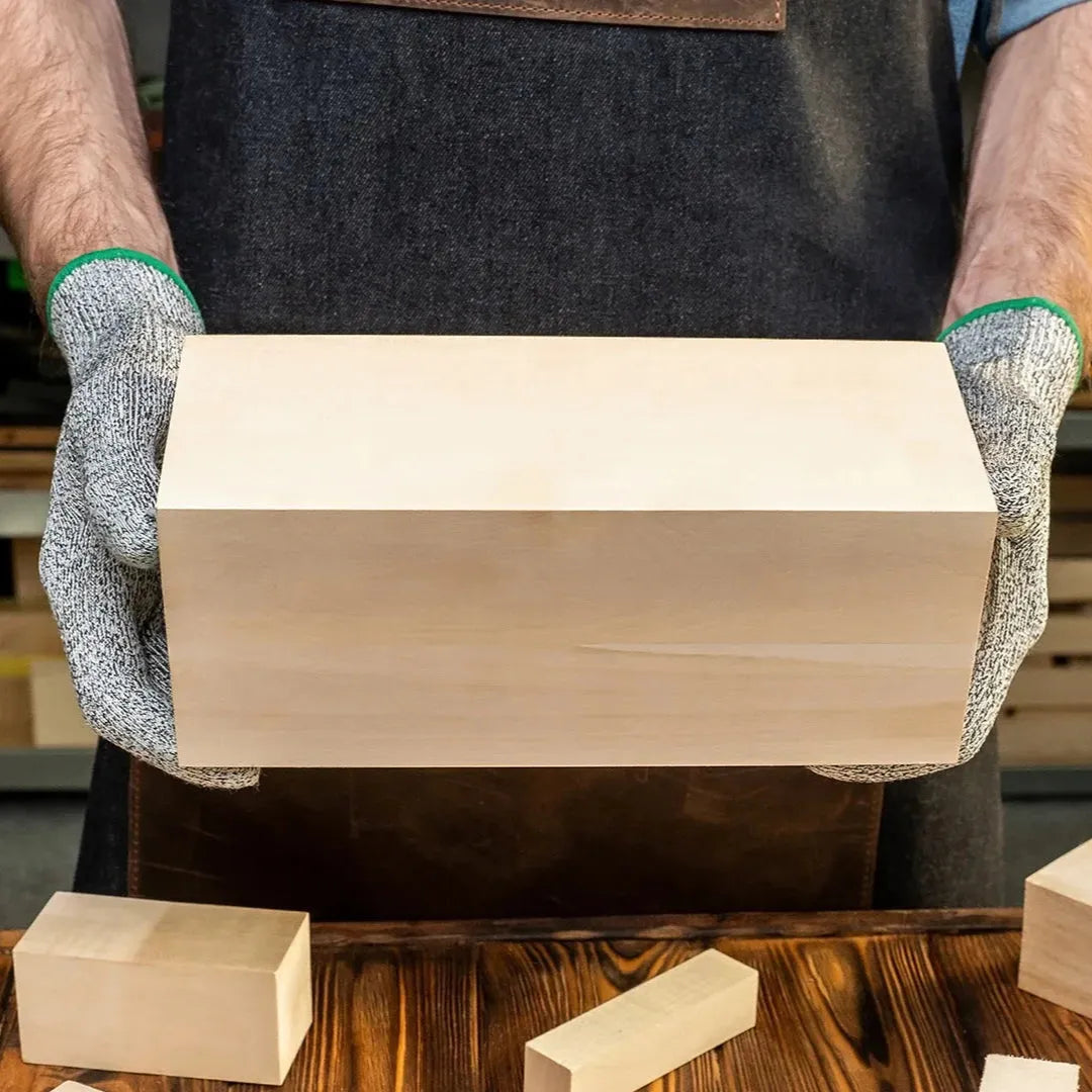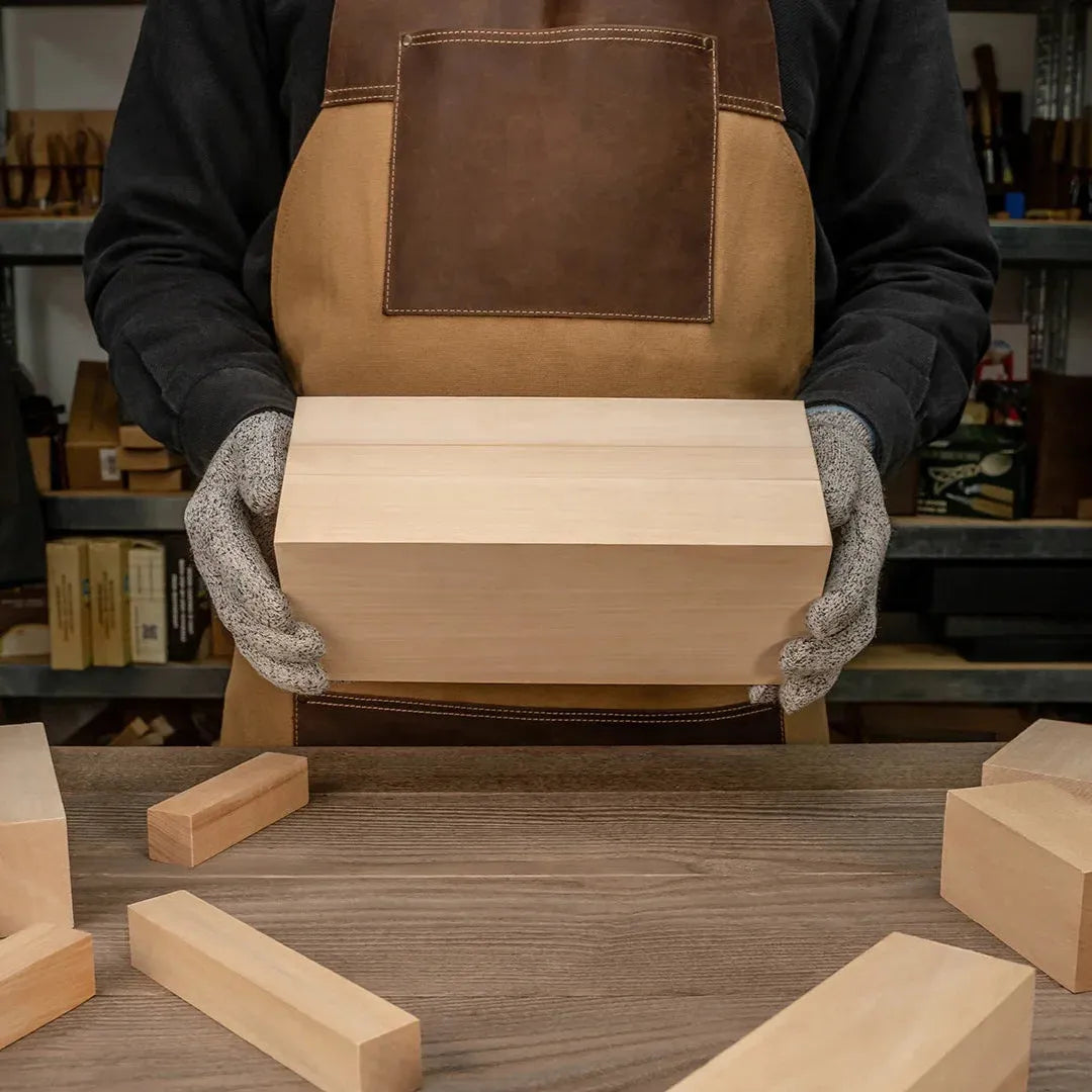 Blokken er laget av naturlig lindetre uten sprekker, noe som gir en behagelig skjæreopplevelse uten overraskelser. Materialets fleksibilitet og styrke gjør det enkelt å forme selv intrikate detaljer. Ulikheter i treverket og årringer kan forekomme og gir treverket et unikt og personlig preg.