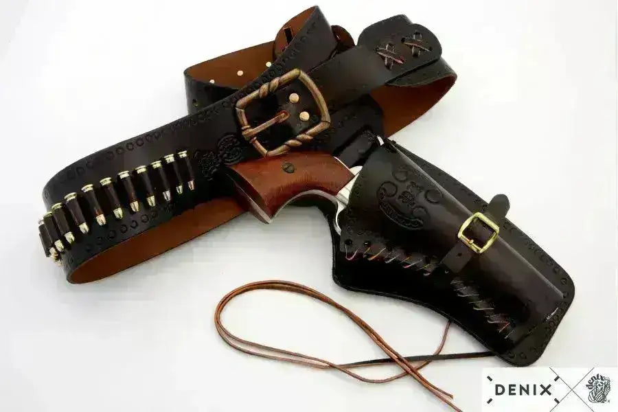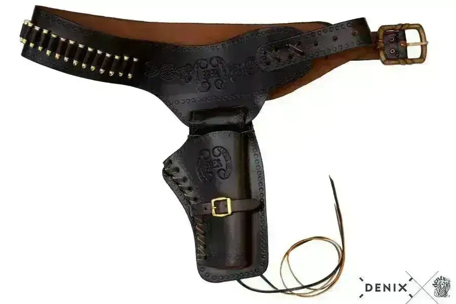 Denix Western belt with holster for right-handed people. Made of leather and is a top quality cowboy belt with holster for the right side.