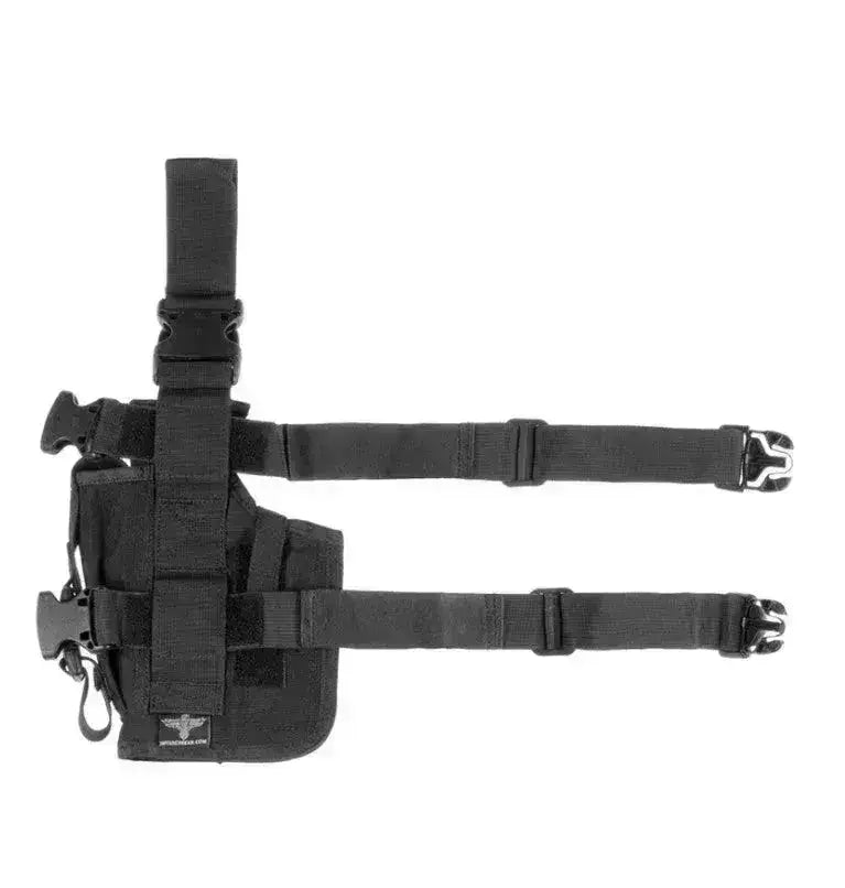 Adjustable thigh holster that fits a whole range of pistols. Holsters can be fastened in the belt and around the thigh so that it sits securely.