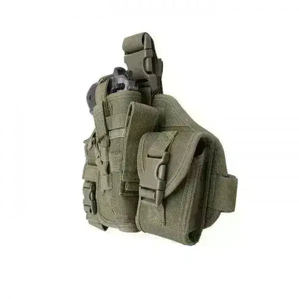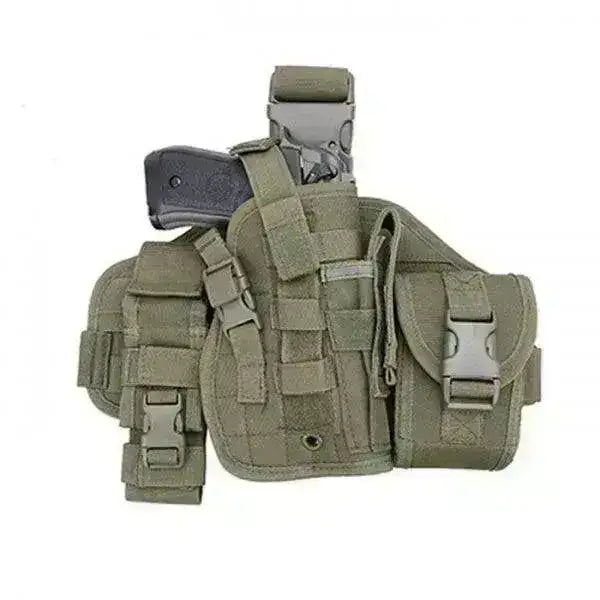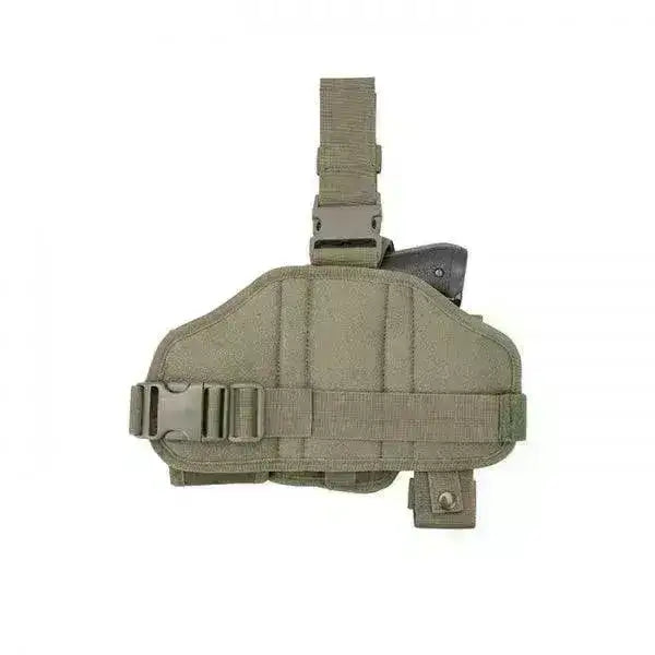 This thigh holster is not a traditional thigh holster, it is a "leg panel" with a removable pistol holster attached. The panel itself is made of nylon fiber and is equipped with MOLLE fasteners that you can attach any molle accessories you want to your thigh. The pistol holster that is fitted fits the vast majority of pistols and can be easily removed if, for example, you would rather use it loosely as a belt holster and rather use the panel for something else.