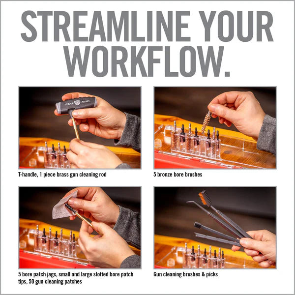 Master Cleaning Station® fra Real Avid er et komplett og praktisk rengjøringssystem utviklet for vedlikehold av håndvåpen. Settet kombinerer en stor, polstret og oljeresistent matte med et komplett rengjøringssett organisert i en integrert verktøykasse.