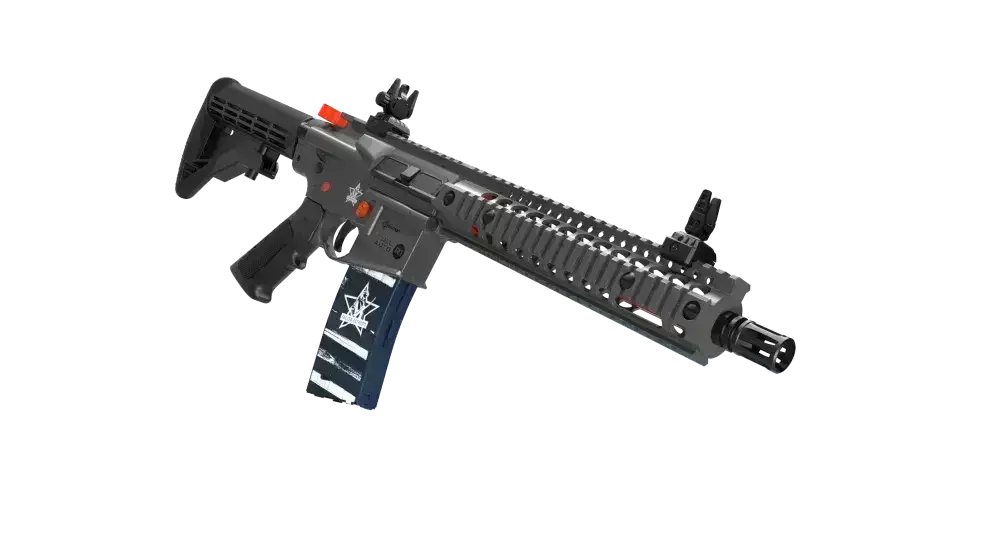 Stylish M4 rifle with adjustable stock and full rail. Full-auto rifle with limited edition "Fallen Patriot" design. It can spit Shoots 4.5mm BB bullets at high speed and with a firing rate of up to 1400 rpm. It doesn't get more fun than this! In addition to good power and a high rate of fire, this rifle offers good shooting practice. Set up bottles, cans and flashlights in a suitable place, and you can shoot away! Remember safety glasses as steel bullets can ricochet!