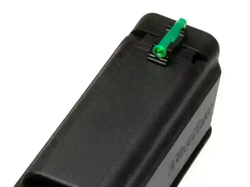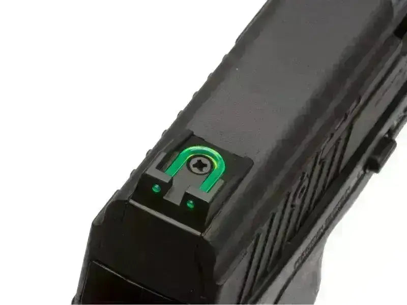 The iron sights are green fiber optics which makes aiming easy. On the underside of the barrel is a 21mm mount for attaching a flashlight or laser if desired.