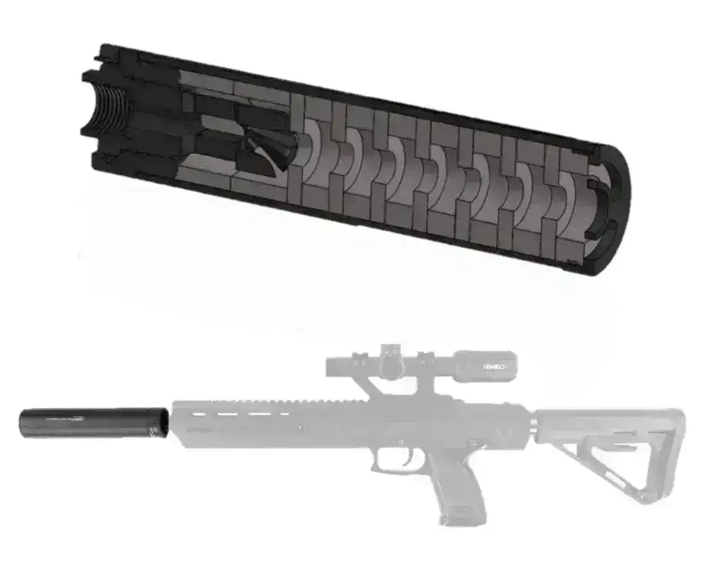 Silencer for airsoft with a dampening effect. The silencer is made of the same type of aluminum used in aircraft, the foam inside the silencer is the same type used in recording studios to absorb as much sound as possible. Also check out cover from Novritsch.