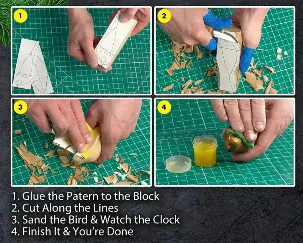 The bird wood carving set contains everything you need to get started with carving and create a great wooden figure.