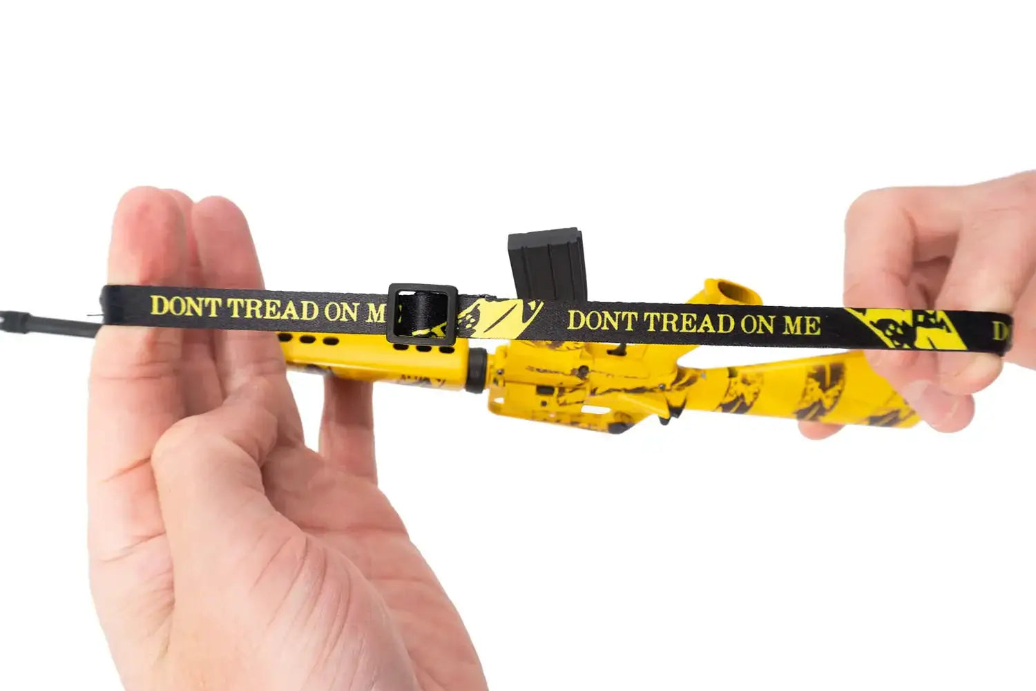 - Yellow and black carrying strap with "Don't Tread on Me" motif