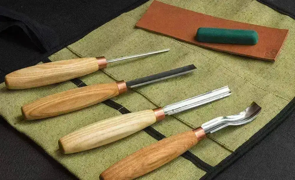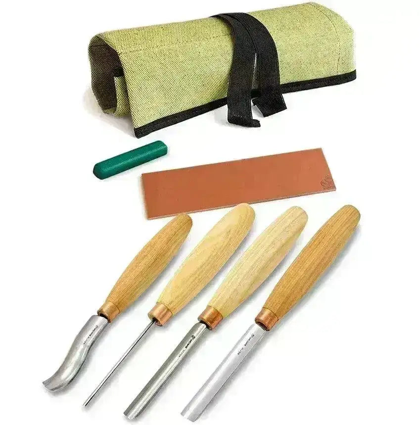 Handmade wood carving tools from Ukraine. The SC01 set is perfect for those who want the right equipment to shape and carve beautiful designs in their wood projects. You get a canvas roll with 4 different tools, the blades are made of carbon steel that stays sharp for a long time. These handmade gouges are sharpened and ready right out of the box.