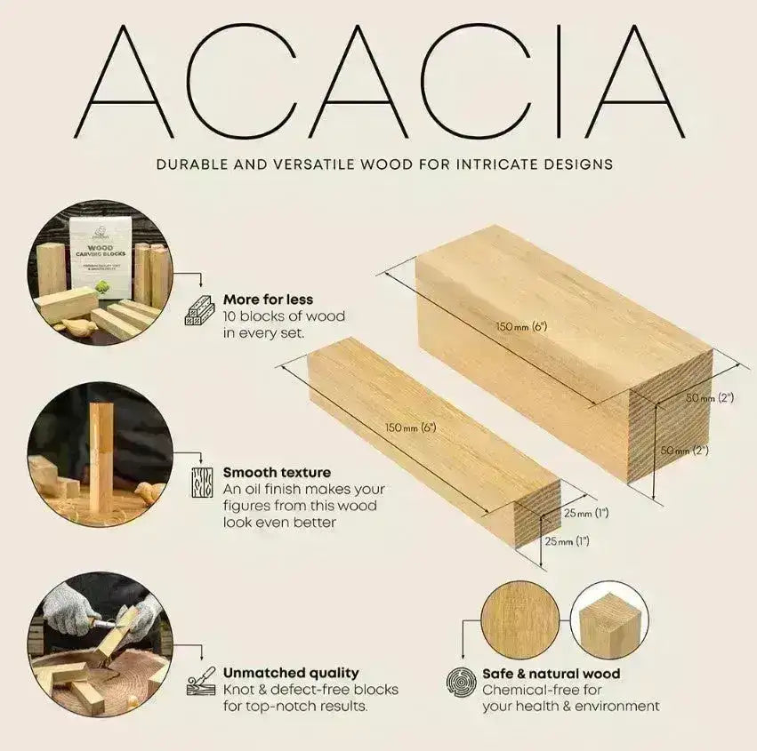 Acacia wood is a favorite among many wood carvers as the wood is robust with beautiful patterns and details. Take your time on the details and sanding to guarantee beautiful and unique results.