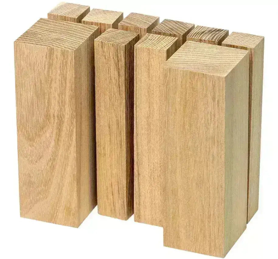 In the set, you get 8pcs 2.5cm x 2.5cm x 15cm wood blocks and 2pcs 5cm x 5cm x 15cm wood blocks.