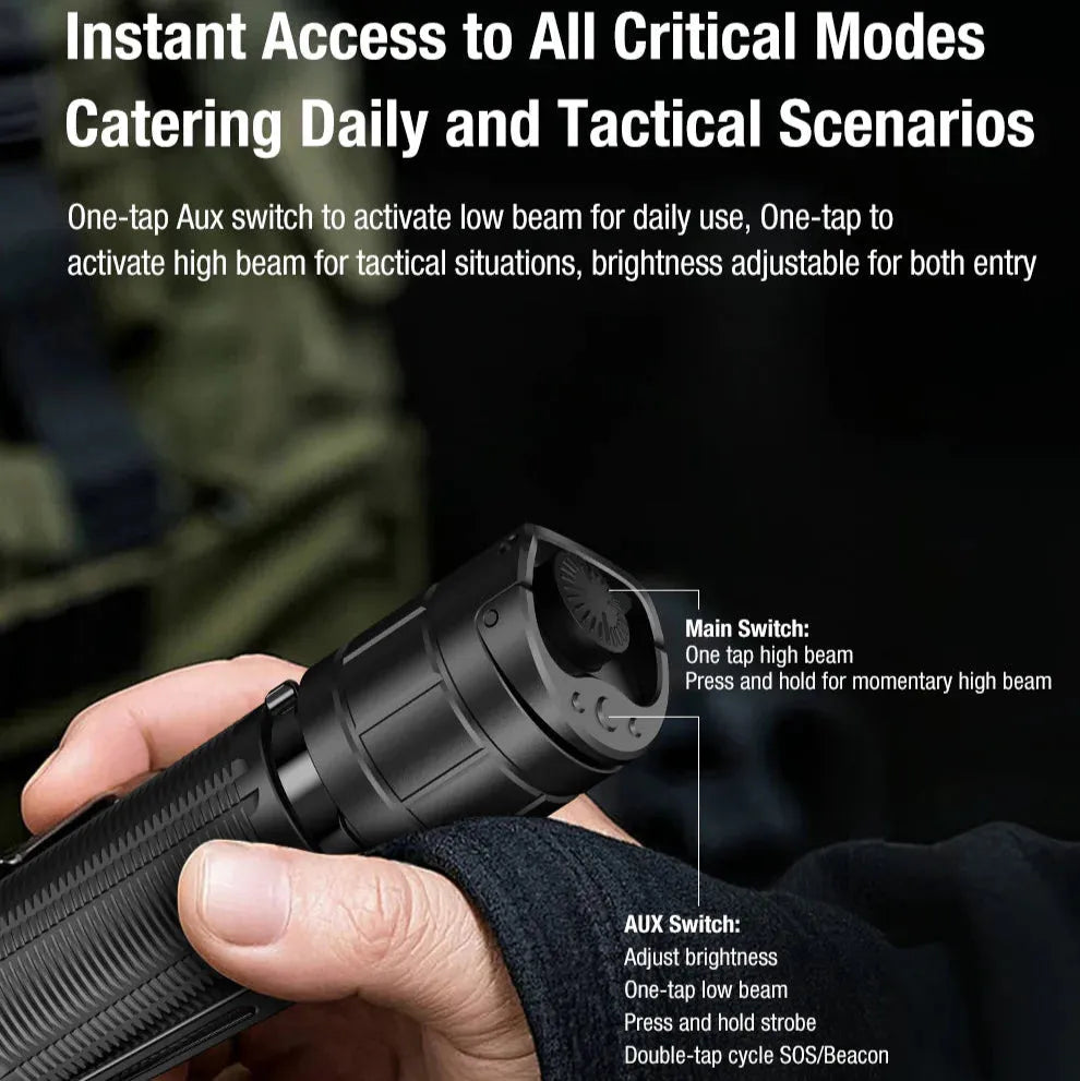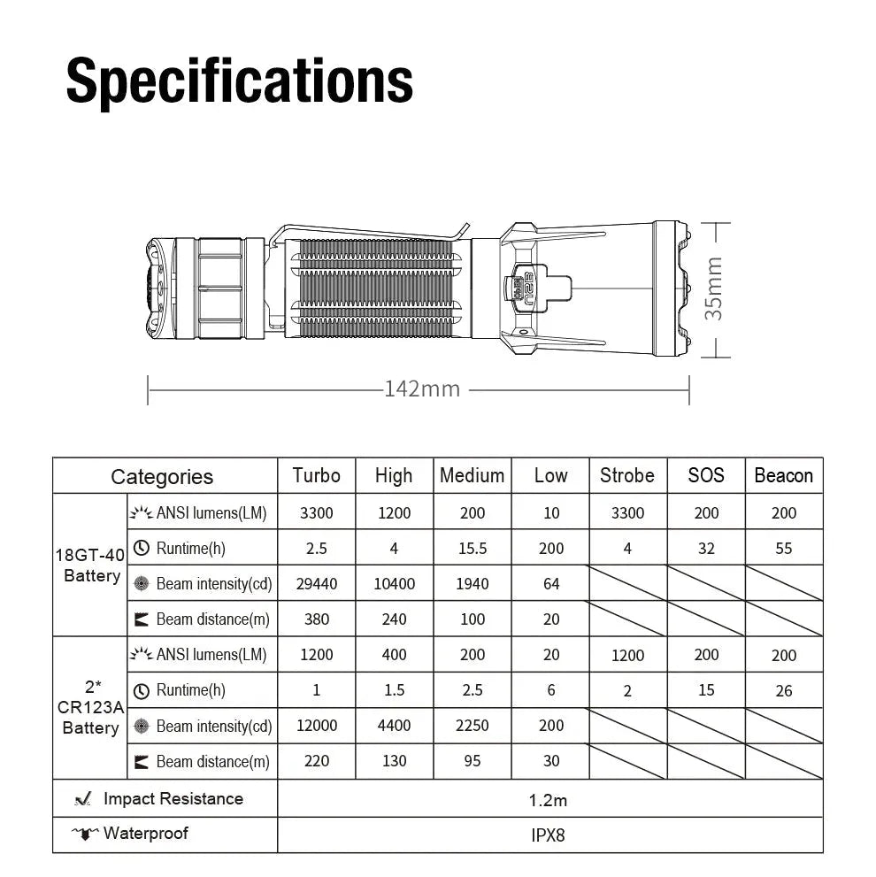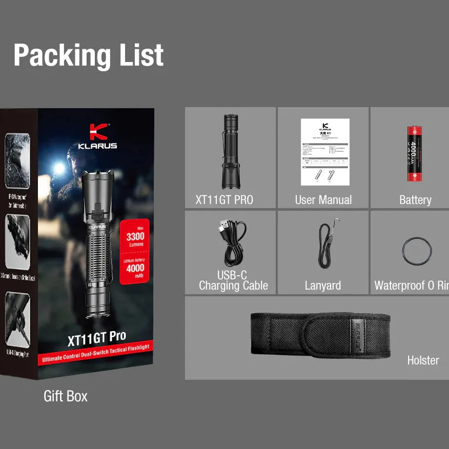 The Klarus XT11GT PRO-V3 is a powerful and versatile tactical flashlight designed for professional users, outdoor enthusiasts, and emergency situations. With an impressive brightness of 3300 lumens, this flashlight illuminates areas up to 380m, perfect for demanding conditions.