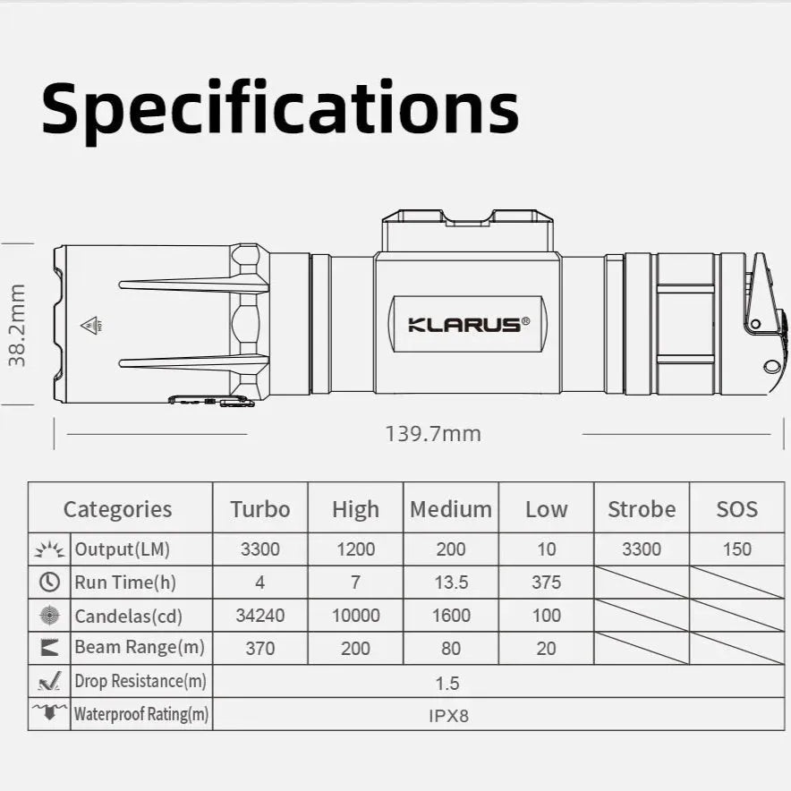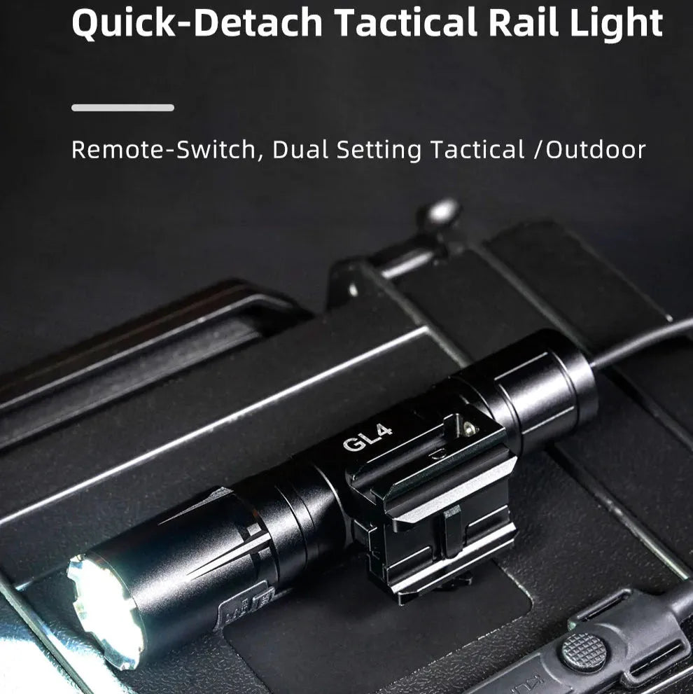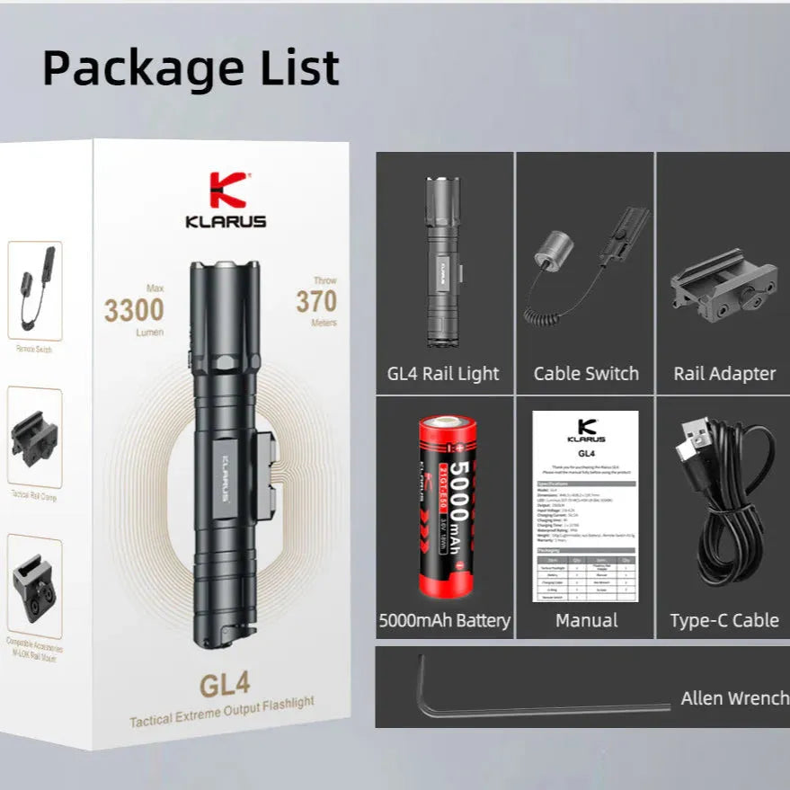 KLARUS GL4 3300lm Tactical Weapon Light with Rail Mount Maximum Brightness for Tactical Use KLARUS GL4 delivers an impressive 3300 lumens, providing extreme brightness even in the darkest environments. Perfect for professional use, hunting, and self-defense. The light comes with a 21mm adapter so it can be mounted on weapons. An external pressure pad is included. Tactical Control for Quick Response Control – Quick and intuitive operation for immediate response in combat or emergency situations. Professional Cable Switch – Flexible mounting with remote switch for maximum versatility, the switch can be attached to a 21mm rail or taped to a grip. Long Battery Life for Reliable Operation With a battery life of up to 375 hours, KLARUS GL4 is an ideal companion for long operations.Built to withstand demanding conditions, this flashlight ensures reliable performance under all conditions.