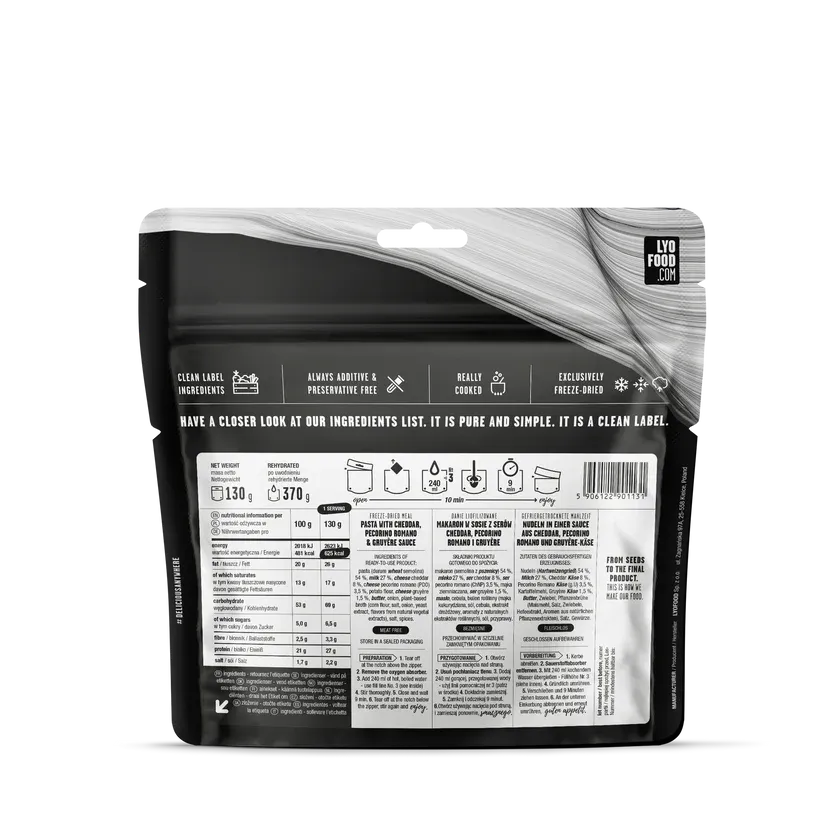 LYOFOOD Mac & Cheese – Creamy pasta dinner with cheese sauce Classic comfort food for the trail – quick, hearty, and flavorful LYOFOOD Mac & Cheese delivers the authentic taste of American cheese pasta – in a lightweight and durable, travel-friendly form. This hearty dish combines macaroni with a creamy sauce made from cheese, milk, and butter – all made with 100% natural ingredients and without artificial additives. Perfect for a quick dinner on the trail, expedition, or in your emergency stash.Specifications Weight (net) 90g Prepared weight 370g Servings 1 adult serving Shelf life Up to 5 years Benefits 100% natural ingredients – no artificial additives Cheese pasta made with real cheese, milk, and butter Ready in 10 minutes – just add boiling water Long shelf life and low weight – ideal for hiking and emergency preparedness Nutritional content (per 100g dry product) Energy: 1827kJ / 436kcal Fat: 18g (of which saturated fat: 12g) Carbohydrates: 47g (of which sugars: 4g) Fiber: 3.2g Protein: 17g Salt: 2.3g Ingredients