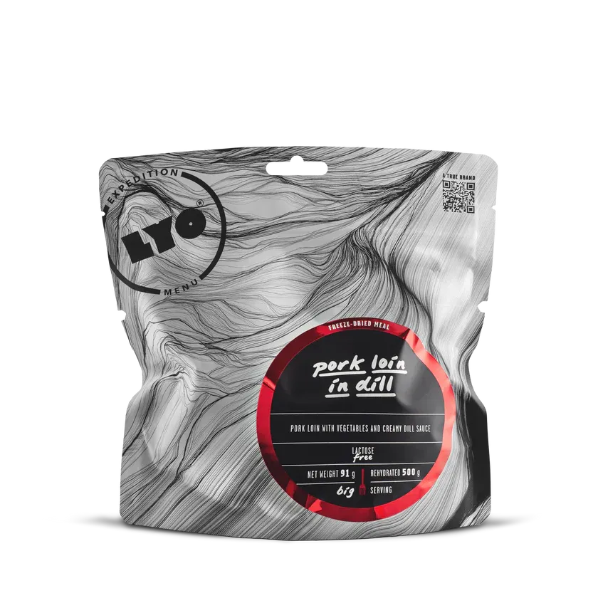 LYOFOOD Pork Loin in Dill Sauce is a flavorful dinner with pork and potatoes in a mild, spicy dill sauce. The dish contains 100% natural ingredients – no artificial additives – and is lactose-free. It offers a rich and satisfying experience, perfect for hiking, expeditions, or field use where you need good food with low weight and high durability.