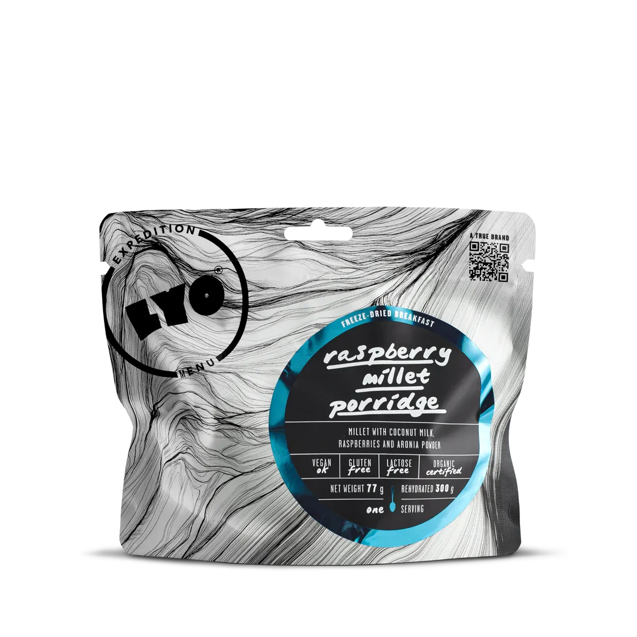 A delicious breakfast porridge with organic millet, coconut milk, raspberries, and aronia. Sweetened with agave syrup and completely free from additives. This breakfast from LYOFOOD provides a nutritious and natural boost – perfect for hiking, expeditions, or busy weekdays. Gluten-free, vegan, and lactose-free.