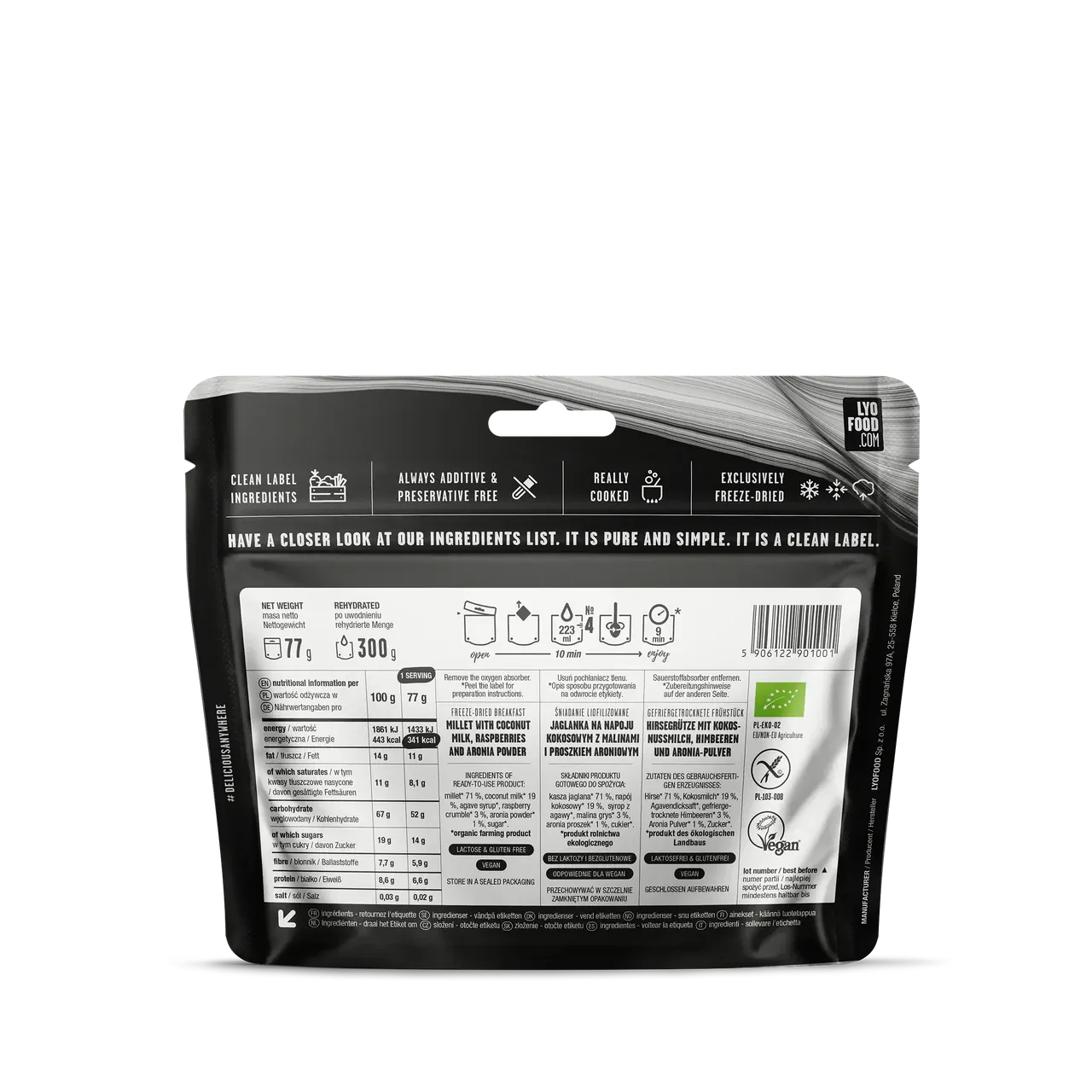 Benefits 100% organic ingredients – no additives Vegan, gluten-free, and lactose-free Long shelf life – up to 3 years Ready in 9 minutes – just add hot water directly to the bag Nutritional Content (per 77g serving) Energy: 1433kJ / 341kcal Fat: 11g (of which saturated fat: 8.1g) Carbohydrates: 52g (of which sugars: 14g) Fiber: 5.9g Protein: 6.6g Salt: 0.02g Ingredients Millet* (71%), coconut milk* (19%), agave syrup*, raspberry cream* (3%), aronia powder* (1%), sugar* *From organic farming Preparation Tear off the top, remove the oxygen absorber, add hot water (about 150ml), stir well and close the bag. Wait for 9 minutes, stir again and enjoy.Customers purchase the products at their own risk and are responsible for complying with all local legal requirements regarding the purchase, possession, use, or transport of the goods available in the online store.