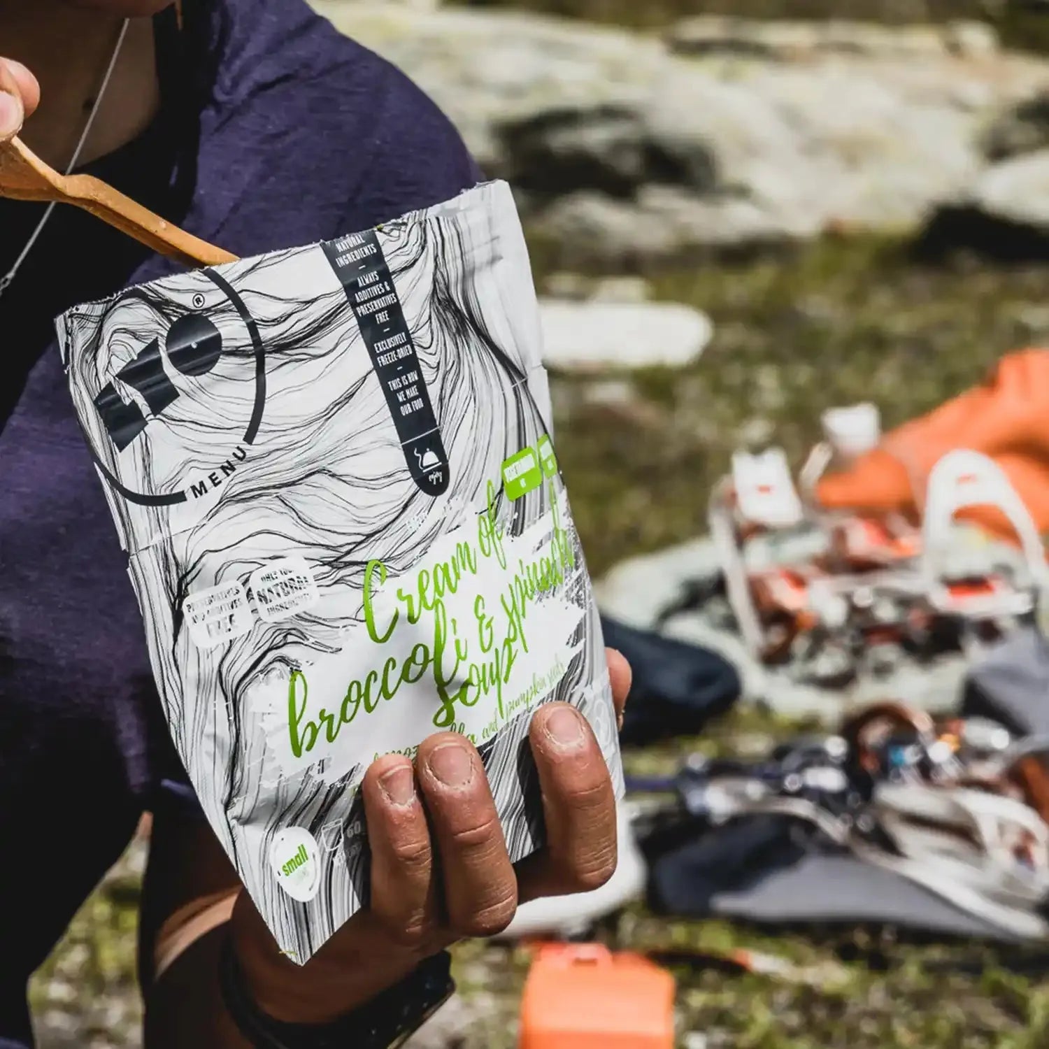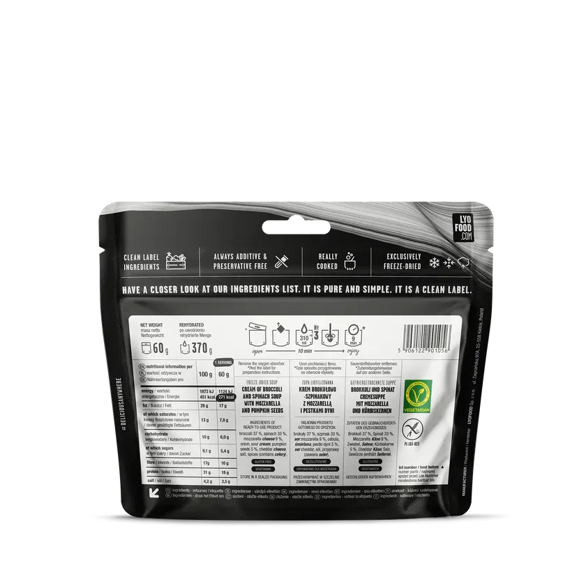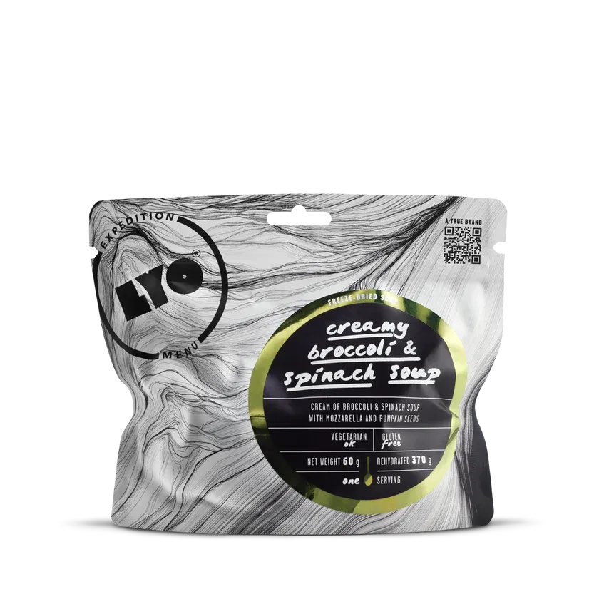 LYOFOOD Creamy Broccoli & Spinach Soup combines broccoli, spinach, and cream into a warming and flavorful soup. Made with 100% natural ingredients, completely free of gluten and artificial additives. Perfect as a light dinner, appetizer, or snack on mountain hikes, expeditions, or camping where low weight and quick energy are important.