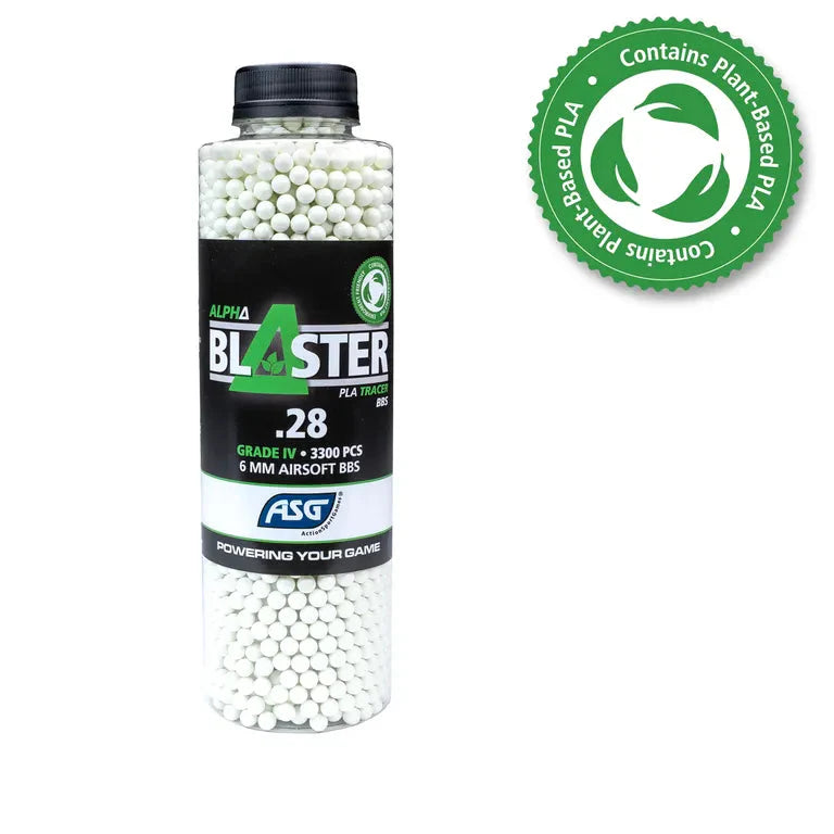Alpha Blaster Tracer PLA BBs er laget av plantebasert PLA – en termoplastisk polyester fra fornybare ressurser. Materialet brytes raskere ned i naturen ved påvirkning av fuktighet og oksygen, er ikke-giftig og tryggere for både mennesker og miljø. BB-ene er testet i henhold til både EU- og USA-standarder.