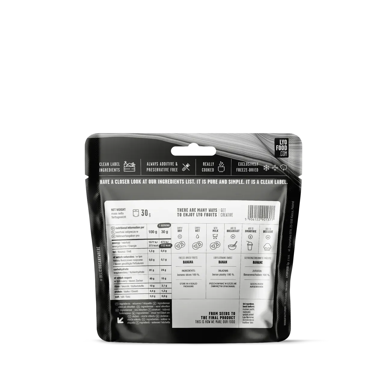 Disse frysetørkede bananskivene fra LYOFOOD er laget av ren banan – ingen tilsatt sukker, ingen oljer, ingen konserveringsmidler. Et fantastisk alternativ til fritert eller tilsatt tørket frukt. De smaker naturlig søtt, gir energi og holder seg sprø lenge. Ideelle for tur, sport, hverdagskos eller som topping i frokost og dessert.
