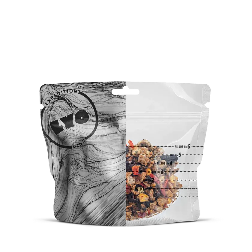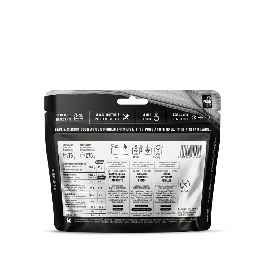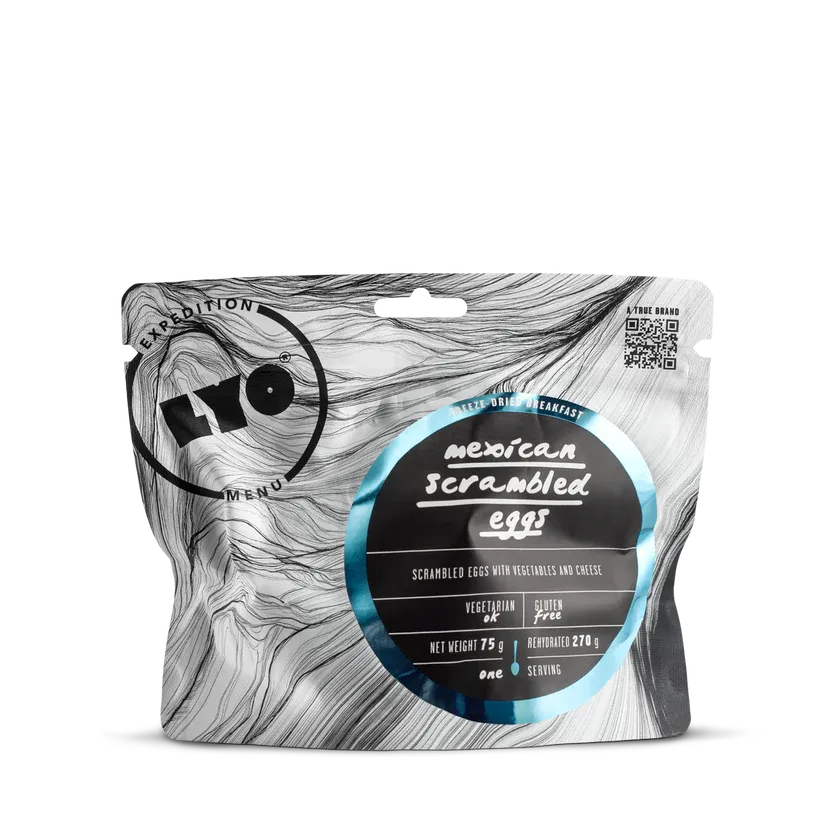 LYOFOOD Mexican Scrambled Eggs er en varm og mettende frokost med krydrede grønnsaker, eggeblanding og ost. Inspirert av meksikanske smaker og laget med 100 % naturlige ingredienser. Retten er fri for konserveringsmidler og kunstige tilsetningsstoffer, og passer perfekt for fjellturer, ekspedisjoner og camping – når du trenger en god og rask start på dagen.