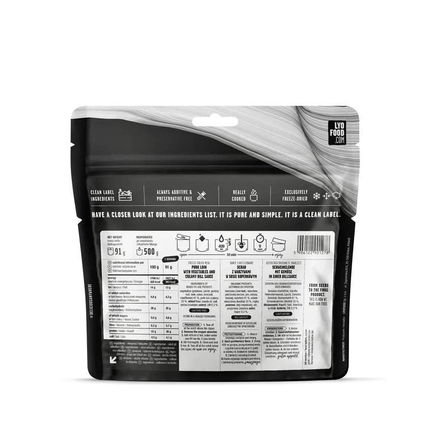 LYOFOOD Pork Loin in Dill Sauce er en smaksrik middag med svinekjøtt og poteter i en mild, krydret dillsaus. Retten inneholder 100 % naturlige ingredienser – ingen kunstige tilsetningsstoffer – og er fri for laktose. Den gir en fyldig og mettende opplevelse, perfekt for tur, ekspedisjon eller feltbruk der du trenger god mat med lav vekt og høy holdbarhet.